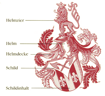 Wichtigster Bestandteil eines Wappens ist der Schild: Nur das in einen Schild gestellte Bild kann als Wappen angesprochen werden. Der Schild wechselte seine Form im Laufe der Geschichte vom `normannischen´ Schild über die Dreiecksform, den tartschenförmigen Schild und die barocke Kartusche zu dem heute üblichen, unten halbkreisförmigen Rundschild, der sich für die Aufnahme komplizierter und gegliederter Wappenbilder besonders eignet.