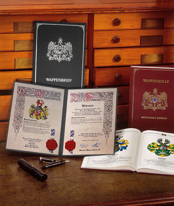 Die farbige Abbildung Ihres Wappens in Ihrem persönlichen Wappenbrief. Die Registriernummer für die Wappenrolle Münchner Herold. Erteilung der Führungsberechtigung für Ihr Familienwappen.