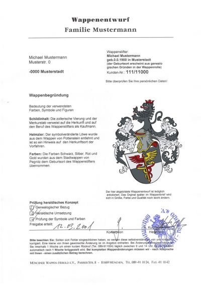 Bei einer Wappenerstellung erhalten Sie innerhalb von 2 bis 4 Wochen einen Wappenentwurf in Farbe, mit einer genealogischen und heraldischen Begründung der verwendeten Farben und Symbole. Bei Bedarf kann dieser Wappenentwurf einmal ohne weitere Zusatzkosten korrigiert werden. Erst wenn der Wappenentwurf von Ihnen freigegeben wird, kann der Wappenbrief ausgefertigt werden. Eilige oder Terminaufträge werden vorgezogen – bei Bedarf bitte mitteilen.
